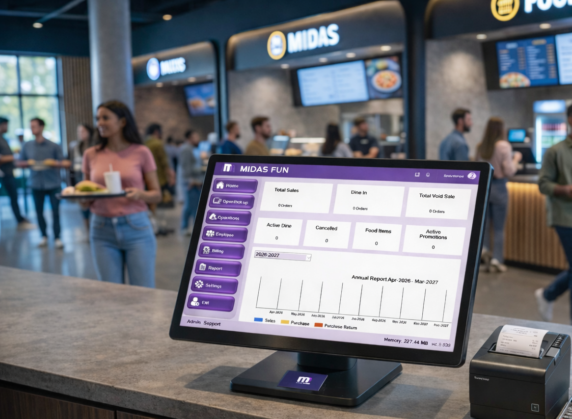 Midas POS is a smart food and beverage POS system designed for restaurants and food outlets, offering efficient inventory, kitchen, and table management.