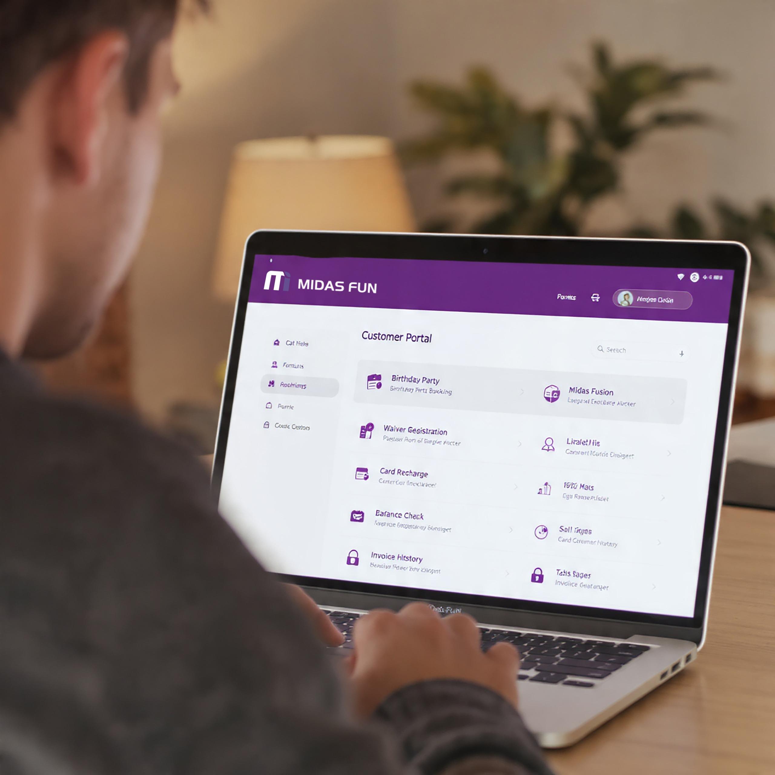Midas Fusion is a premium, integrated web application designed for both management and customers with secure login access. Customers can book birthday parties or events, register waiver forms, recharge card accounts, check balances, and view invoices online. For management, the web app provides detailed reports, analytics, role-based dashboards, and real-time business status updates. Features include multi-factor authentication, instant business day summaries, online booking visibility, and technical support access. Midas Fusion serves as the centralized digital control center for operations and analytics.