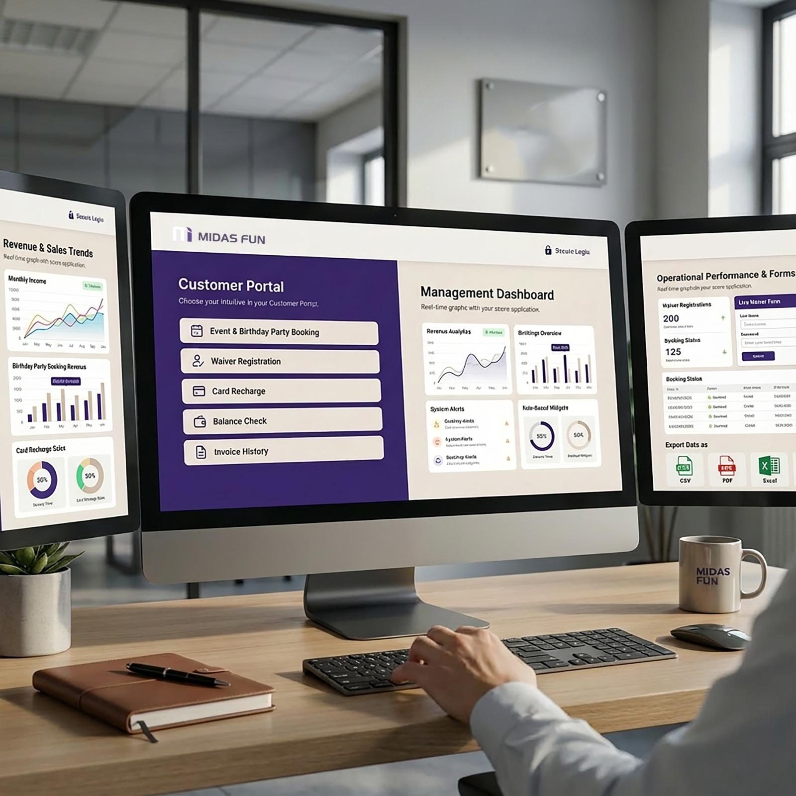 The Web Application & Reporting System provides a centralized, browser-based platform for monitoring, managing, and analyzing business operations in real time. It enables online birthday party bookings, card recharges, waiver registrations, and access to advanced reports.